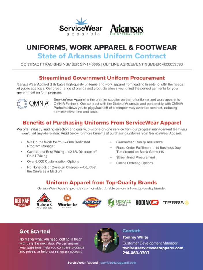 Learn how you can start benefiting today from Arkansas’s contract with ServiceWear Apparel.
