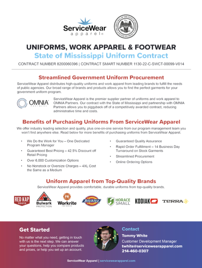 Learn how you can start benefiting today from Mississippi’s contract with ServiceWear Apparel.