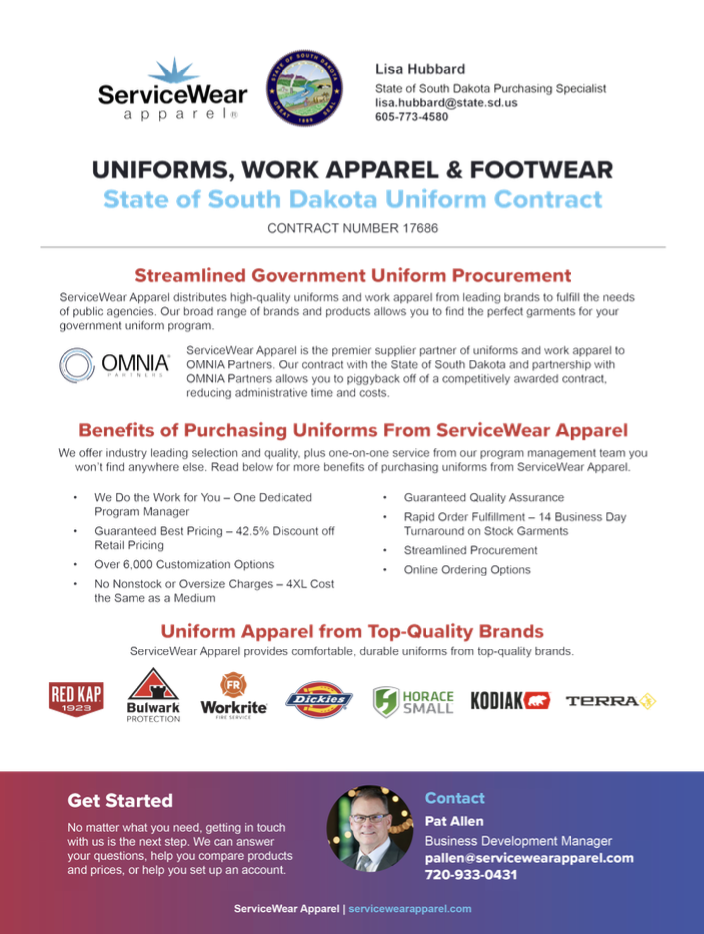 Learn how you can start benefiting today from South Dakota’s contract with ServiceWear Apparel.